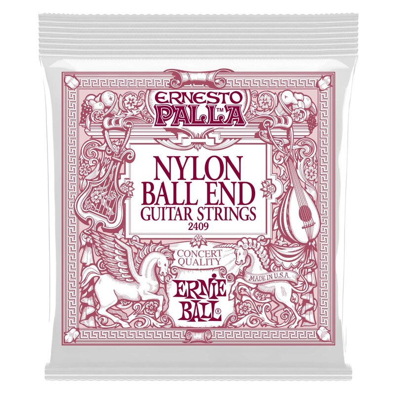 Ernie Ball Ernesto Palla concert quality classical guitar treble strings are made of black nylon monofilament. Gold wound basses are made of 80/20 bronze wrapped around a nylon multifilament core providing a smooth, rich tone. These strings feature ball end construction for faster, easier installation over traditional tie-end strings. All Ernie Ball strings are precision manufactured to the highest standards and most exacting specs to assure consistency, optimum performance, and long life.