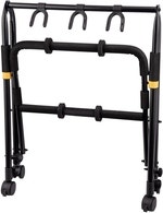 Tuotenumero 4075153Kokoontaitettava ja pyörillä varustettu kitarateline kolmelle sähkökitaralle, bassolle tai akustiselle kitaralle.