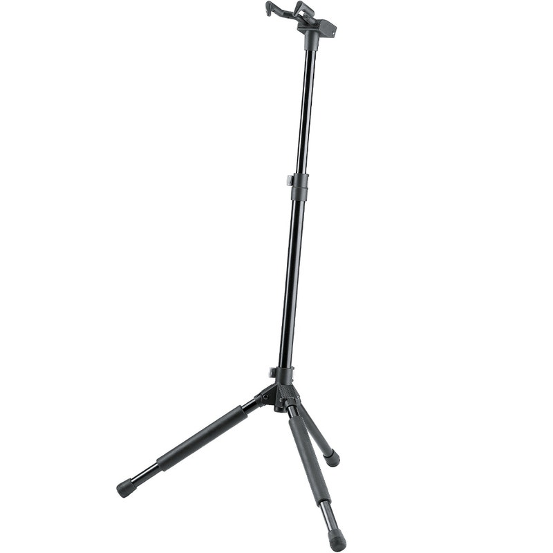 Kokoontaitettava lattiateline kitaroille. Teline on varustettu patentoidulla ja itsestään lukittuvalla pidikkeellä, joka tarttuu tiukasti instrumenttisi kaulaan. Kätevä lukitusvipu helpottaa telineen korkeuden säätöä ja telineen kääntövarressa on mekanismi, joka estää soitinta pyörähtämästä pois telineestä. Telineen kaulanpidikkeessä ja takatuessa on korkealaatuinen ja naarmuttamaton kumipinta, joka suojaa soitintasi.