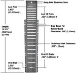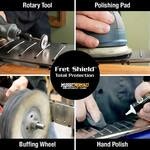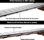 Ei ole mitään parempaa kuin mielenrauha samalla kun säästät aikaa ja rahaa. MusicNomadin patenttihakemuksessa oleva Fret Shield asettaa uuden, korkeamman standardin täydelliselle otelaudan suojaukselle nauhatyöskentelyn aikana, kuten kiillottamisessa, tasoittamisessa ja kruunauksessa. Sano "EI" siniselle teipille uudelleenkäytettävällä suunnittelullamme, joka menee paikoilleen sekunneissa, suojaa täydellisesti vahingoittamatta otelautaa ja kestää satoja nauhatöitä. Korkealaatuinen ruostumaton teräs on täydellisellä paksuudella (.008" / .20mm), valmistettu tarkkuusprosessilla ja kaikki reunat ovat sileitä ja pyöreitä. Innovatiivisesti muotoillut reunat mahdollistavat sisällytettyjen kumilenkkien pitävän Fret Shieldin paikoillaan turvallisesti ja pitävät nauhat pinnan alla estäen niiden vahingoittumisen kiillotusprosessin aikana. Fret Shieldsit tulevat suosituimmissa skaalakoissa ja sisältävät kätevän ripustusholkin. Olipa otelautasi viimeistelty vaahtera tai viimeistelemätön ruusupuu otelautamerkeillä, otelautasi kiittää sinua sen suojaamisesta. Se on MusicNomad-laatua – nostaa rimaa välineiden huollossa.
