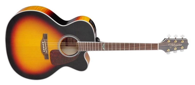 Featuring a solid spruce top and flame maple back and sides, the GJ72CE produces all the volume and robust sound that players expect from a jumbo guitar. The slim mahogany neck and 12”-radius bound laurel fingerboard provide great feel and playability, while the onboard Takamine TK-40D preamp system gives you a built-in tuner, three-band EQ and gain controls, mid contour switch, notch filter and EQ bypass switch for the ultimate in versatility and sound quality.