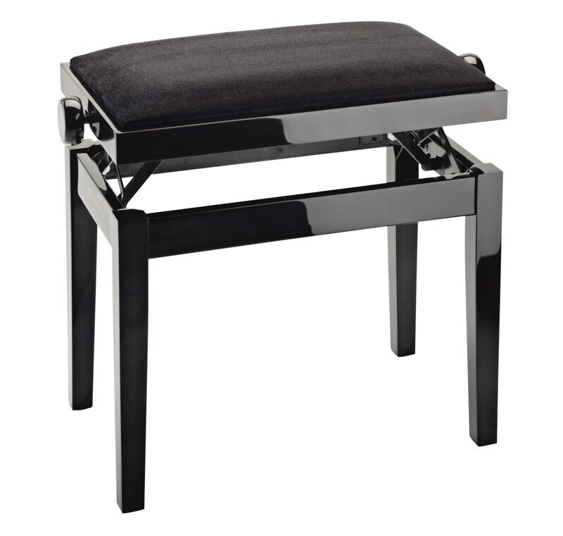Tuotenumero 25513901Klassinen kiiltäväpintainen pianotuoli, jonka istuinosa on päällystetty mustalla samettikankaalla