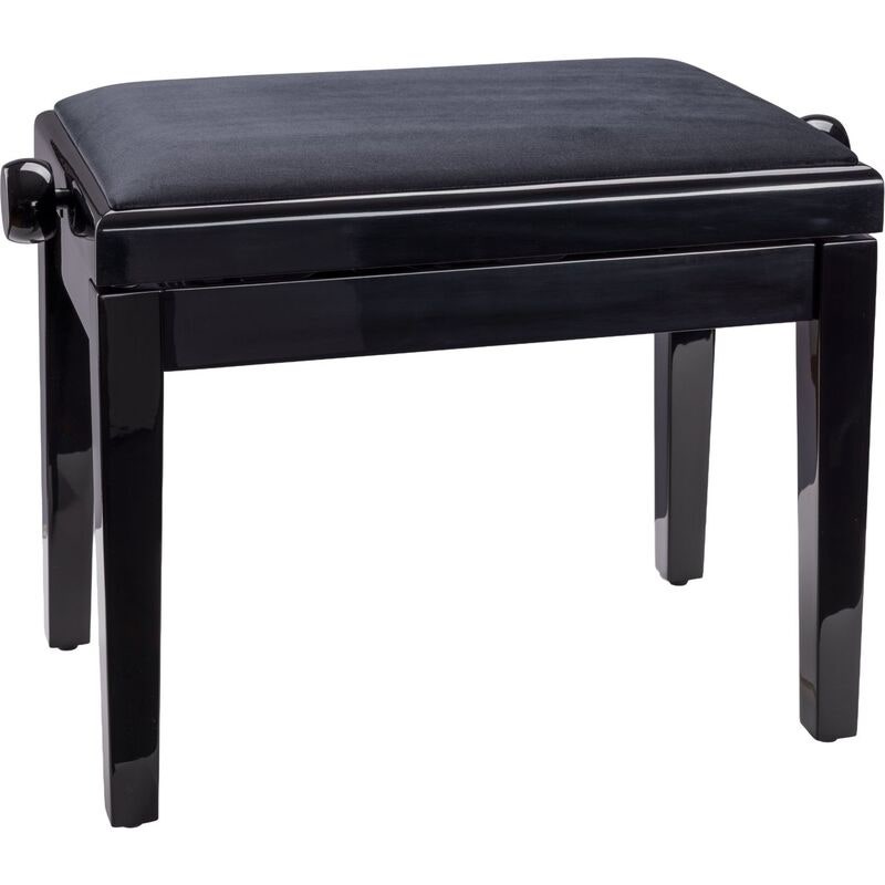 Elegantti kiiltolakattu pianotuoli, jonka istuinosa on päällystetty kulutusta kestävällä kankaalla