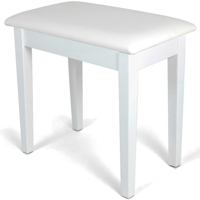 Puinen pianopenkki mattavalkoisella viimeistelyllä ja keinonahkaisella istuinosalla. Istuinosan alta löydät kätevän säilytystilan nuoteille ja muille papereillesi.