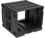8U Roto Rolling Rack, incorporating an innovative new design that includes the one-touch pull handle and back lid mounted wheels for easy transport. Roto Rolling Racks will easily stack with our existing standard and shallow racks. Four military grade butterfly latches secure each lid with an internal rubber gasket that keeps water out so sensitive electronics stay safe and secure in transport.