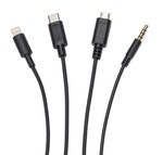 Laitteen mukana toimitetaan kytkentäkaapelit ja tarvikkeet: Micro USB - Lightning -kaapeli, Micro USB - Micro USB-kaapeli, Micro USB - USB-C-kaapeli, Mini-B USB - USB-A-kaapeli, 3.5mm stereokaapeli ja telineadapteri.