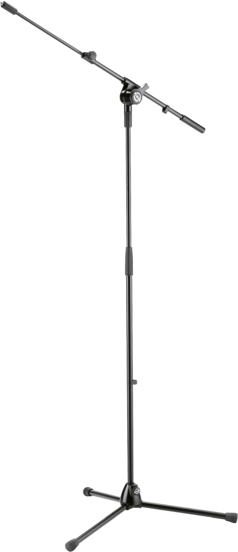 Korkealuokkainen mikrofoniteline teleskooppipuomilla. Telineen taittuvat jalat on kiinni valetussa jalustassa. Patentoitu puristinvarsi voidaan kiinnittää mihin tahansa asentoon ja saat lisäksi kiinnitettyä kiinnitysmekanismiin esimerkiksi mikrofonikaapelin.