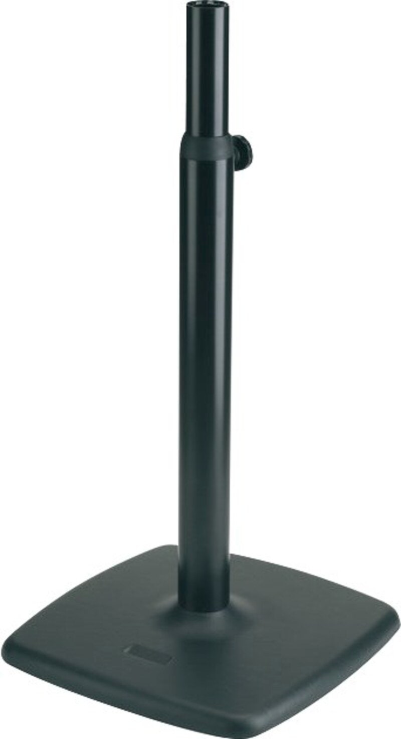 Huomattavan tyylikäs kaiutinteline, jossa tyylikäs 480mm x 480mm valurautajalusta. Paksun jalustaputken korkeus on portaattomasti säädettävissä välillä 800mm - 1350mm.