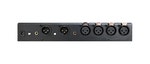 - Liitännät: 4: naaras XLR, 2: uros XLR, 3: (3.5mm), 1 Center Negative power jack.