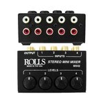 4-kanavainen passiivimikseri RCA-liitännöillä esim. CD-/kasettisoitinten, äänikorttien, mp3-soittimien ym. summaukseen. 4 stereotuloa varustettuna voimakkuudensäädöillä 1 stereolähtöön. Voidaan käyttää myös splitterinä (1 in, 4 out).