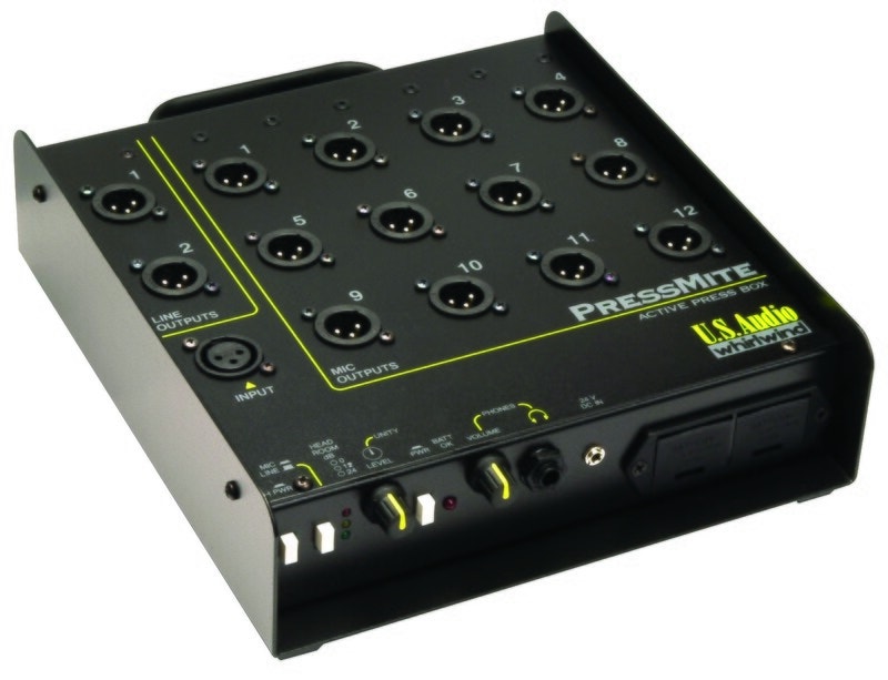 The PressMite® aktiivinen jakoboksi joka pystyy jopa 60 dB gainin nostoon mikrofoni tai linja sisääntuloista. Sisäänrakennettu kuulokevahvistin. Kaksi alkaali (9 V) paristoa riittää jopa 8 tunnin toimintaan