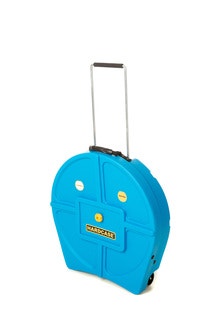 Vaaleansininen pyörillä ja vetokahvalla varustettu symbaalikotelo, joka on suunniteltu yhdeksälle symbaalille...