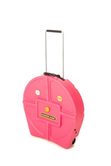 Pinkki pyörillä ja vetokahvalla varustettu symbaalikotelo, joka on suunniteltu yhdeksälle symbaalille (maks....
