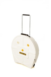 Valkoinen pyörillä ja vetokahvalla varustettu symbaalikotelo, joka on suunniteltu yhdeksälle symbaalille...