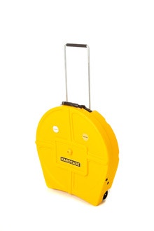 Keltainen pyörillä ja vetokahvalla varustettu symbaalikotelo, joka on suunniteltu yhdeksälle symbaalille...