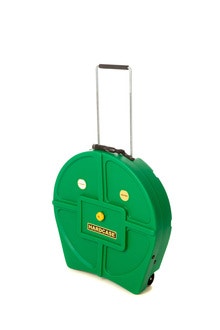 Tummanvihreä pyörillä ja vetokahvalla varustettu symbaalikotelo, joka on suunniteltu yhdeksälle symbaalille...
