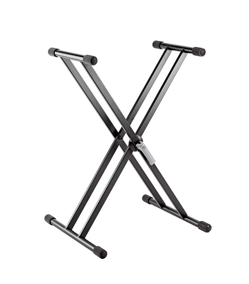 Tyylikäs, kevyt ja erittäin tukeva alumiinirunkoinen X-teline kosketinsoittimille. Ergonominen kiristysvipu helpottaa oikean soittokorkeuden löytämisessä ja telineen kasaamisessa. Voit säätää korkeutta tiheän viiden asteen välein tukevalla hammasrattaalla ja saat valittua aina mukavan soittoasennon. Neljä kiinteää kumista suojaa ja 350mm syvyys tekevät tästä telineestä ihanteellisen kaikille keikkapianoille.