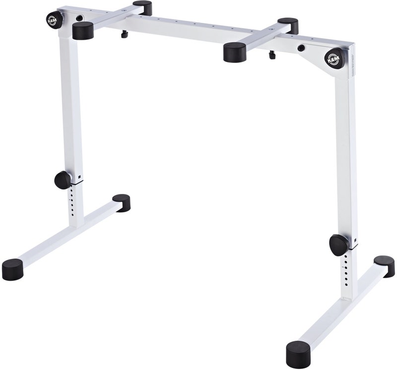 Kompakti teräsputkirakenne ja suuret pyöreät lattiansuojukset tekevät tästä kosketinsoitintelineestä äärimmäisen vakaan. Kahden puolen jousikuormitteiset lukkosäätimet takaavat helpon ja nopean korkeudensäädön.