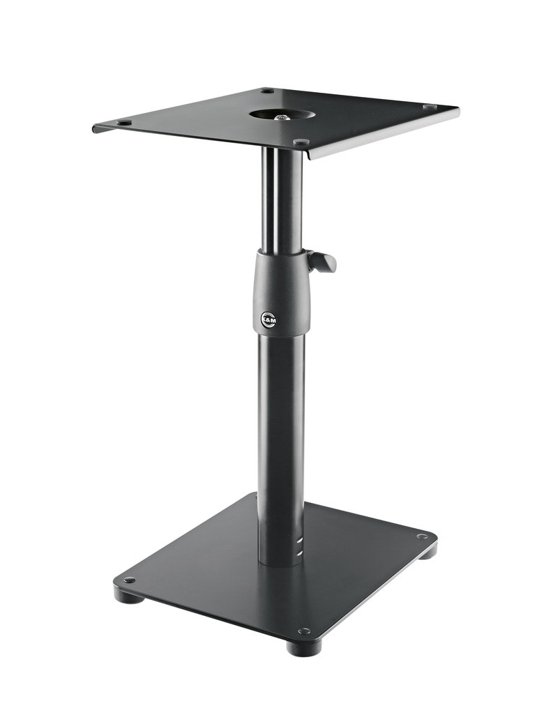 Korkeussuunnassa säädettävä pöytäteline koti -ja studiokaiuttimille. Telineen pohjalevyn alla on neljä huovalla päällystettyä tukea, jotka eristävät ei toivottua tärinää ym. tehokkaasti. Voit säätää telineen korkeutta 350mm – 500mm välillä kuudessa askeleessa.