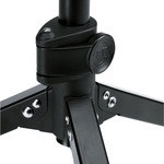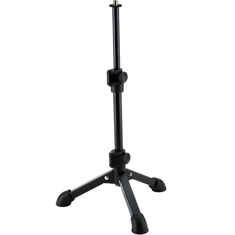 Kevyt pöytämallinen mikrofoniteline teleskooppijalustalla ja taittuvilla jaloilla. Tukevat jalkojen päätysuojat pitävät telineen tukevasti paikallaan ja vähentävät ei-toivottuja äänien heijastuksia. Korkeutta voidaan säätää kätevästi käytännöllisen puristusvivun avulla.