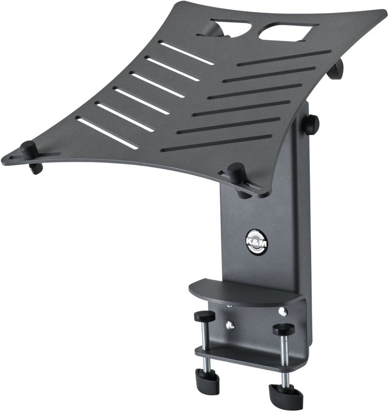 Kokoontaitettava ja kompakti teline kannettavalle tietokoneelle. 120mm leveä ja 65mm syvä pöytäkiinnike sopii hyllypaksuuksille 10mm – 58mm ja kiinnitetään kahdella ergonomisella kiristysruuvilla. 303mm x 284mm alumiinitaso on säädettävissä korkeudeltaan 245mm - 410mm ja sen kallistuskulmaa voidaan säätää tarkasti 8° askelin. Yksittäin säädettävät lukktustapit mahdollistavat kaikkien yleisten kannettavien tietokoneiden, mikserien, CD-soittimien turvallisen käytön.