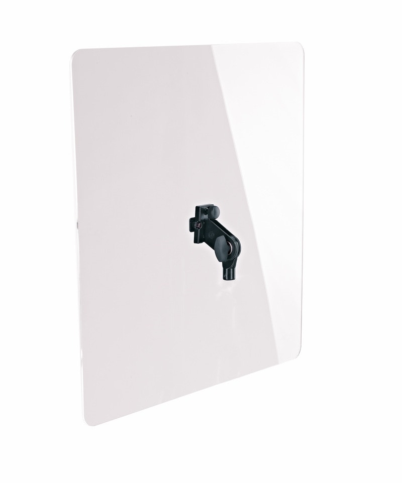 Orkesteri-ja kuorokäyttöön suunniteltu akryylilasisuoja, joka eliminoi äänen heijastuksia ja äänenpainetta. Läpinäkyvä akryylilasi on kooltaan 600mm x 600 mm ja helppokäyttöisen K&M-kiinnikken ansiosta lasin kiinnittäminen ja irrottaminen käy nopeasti. Suoja voidaan kiinniittää kaikkiin mikrofonitelineisiin, joissa on 3/8" kierre.