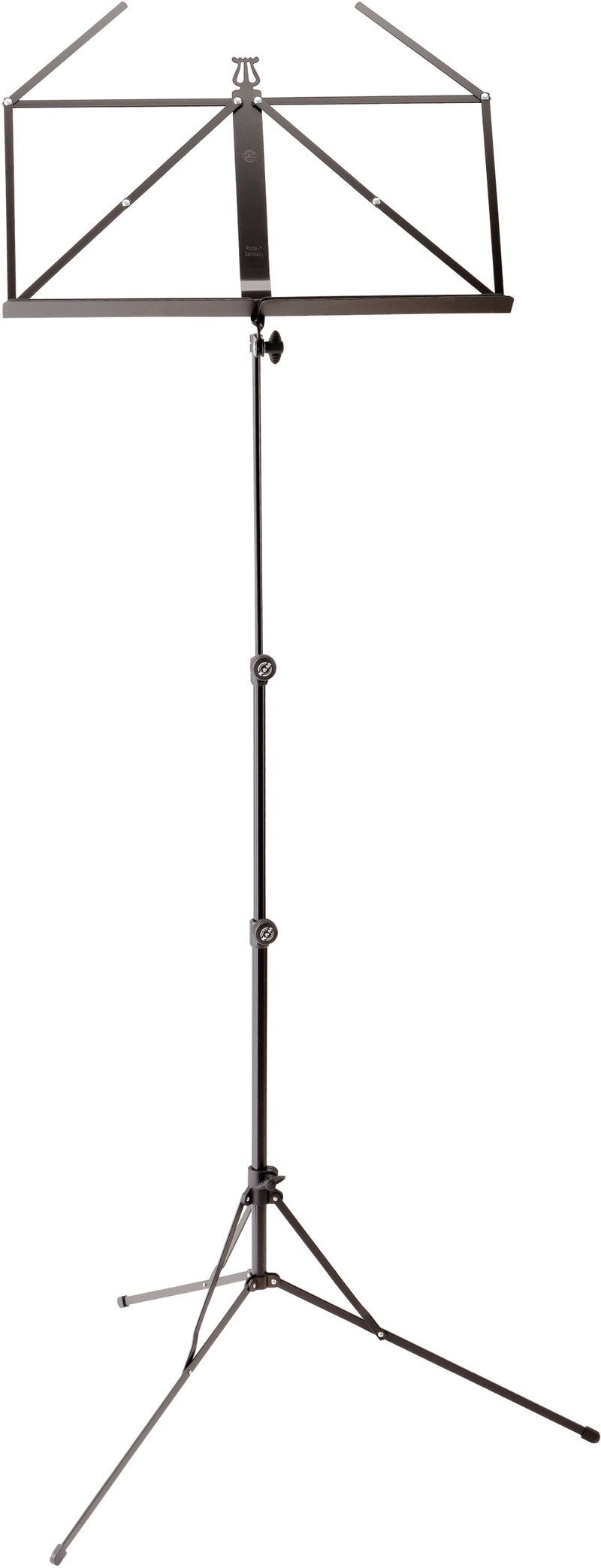 Klassinen kokoontaitettava nuottiteline teleskooppijalustalla. Tämän päivitetyn version kiristyselementit on suojattu paremmin ja ne eivät vaurioita nuottitelineen pintaa. Kulutusta kestävä jauhemaalattu pinta takaa optimaalisen suojan korroosiota vastaan.