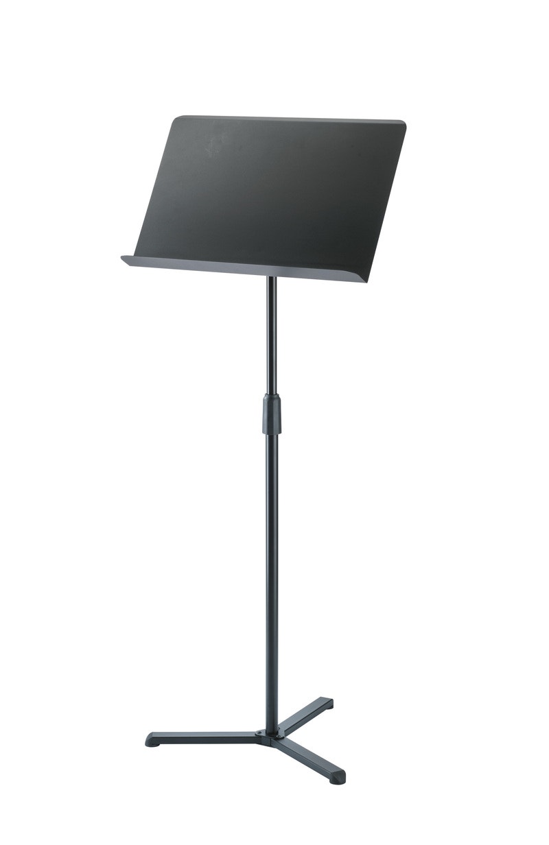 Orkesterinuottiteline, jonka korkeudensäätömekanismi mahdollistaa telineen korkeudensäädön yksinkertaisesti jalustaputkea työntämällä ja vetämällä. Voit varmistaa korkeudensäädön pitävyyden puristusholkilla, kun käytössäsi on yli 2,5Kg nuottikirja. Nuottitason kallistus on portaattomasti säädettävissä, litteä jalustarakenne säästää tilaa esiintymislavalla ja jalusta voidaan myös irrottaa kuljetuksen ajaksi